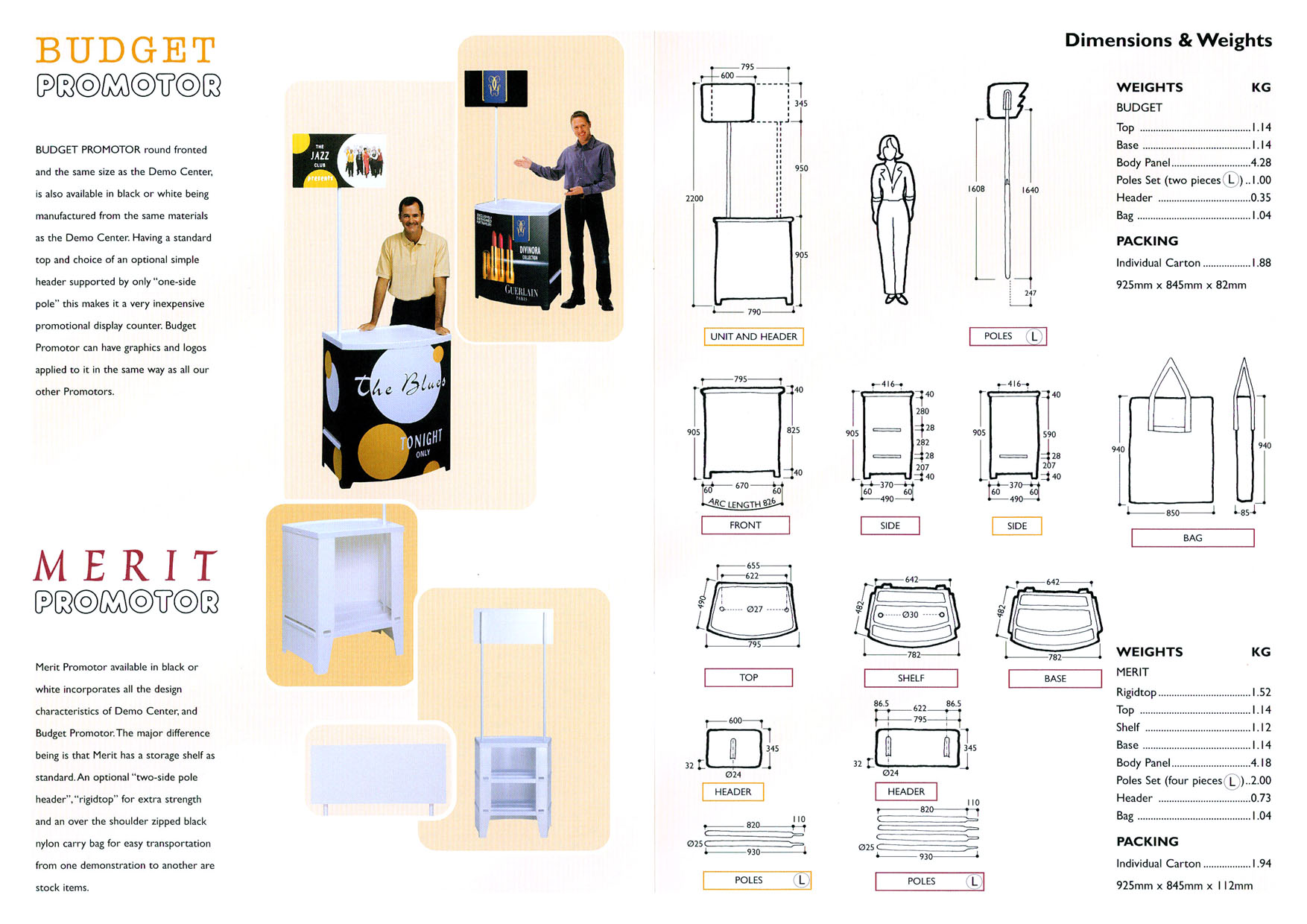 Degustacijski pulti Classic promotor, Budget, Merrit ter Plus so idealna rešitev za degustacije, predstavitve, promocije in številne druge dogodke. Hitro in enostavno jih je mogoče postaviti in dokončno urediti na izbranem mestu. Zaradi grafičnega sporočila na stranicah pulta so izredno učinkoviti in primerni za oglaševanje. Dodajte še napisno zastavico ali ploščo za še večji vizualni učinek. Znotraj pulta je na voljo prostor za shranjevanje prospektov, različnih vzorcev in dokumentacije. Pult lahko opremite še s policami ter odlagalno ploščo. Lažji transport in pakiranje vam omogočajo najlonske torbe oziroma kovčki.